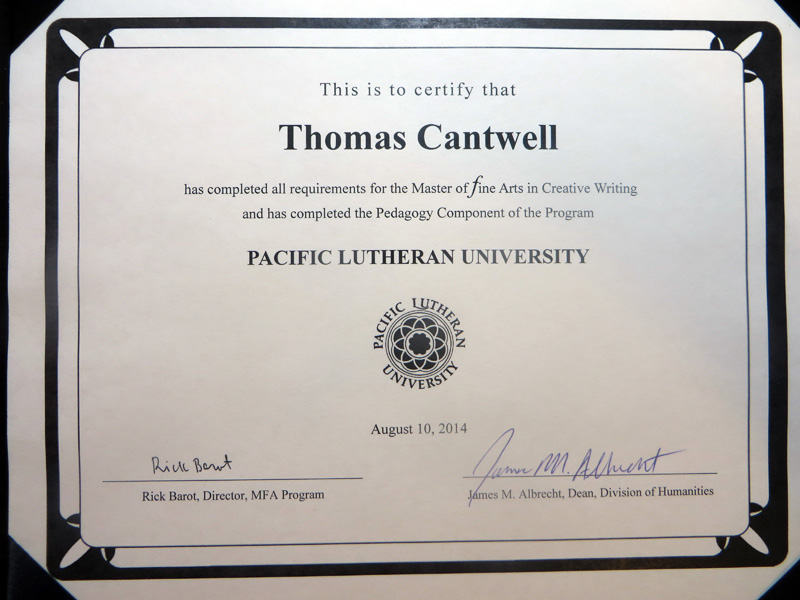 It’s official! Well, this isn’t the official diploma, but I finished my MFA program at the Rainier Writing Workshop at Pacific Lutheran University. What an amazing three years. I’ve learned so much and made so many great friends. At our graduation lunch, Gary Ferguson spoke about a project he did on nature-oriented creation myths from around the world, and how after reading about a hundred of them, he noticed three common elements: beauty, community, and mystery. He suggested that these are things we should focus on in our lives and in our writing. Sounds about right to me.